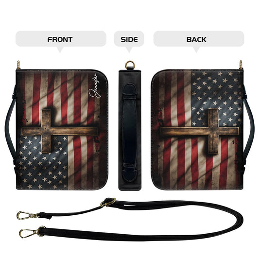 Patriotic American Flag & Cross Bible Cover – Custom Name Option | CHRISTIANARTBAG