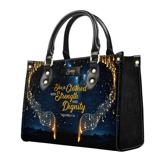 She is Clothed with Strength and Dignity - Elegant Music - Christian Leather Handbag with Bible Verse – CHRISTIANARTBAG - CAB01022225