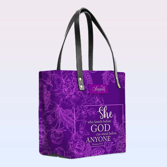 Personalized Leather Tote Bag with Bible Verses – She Who Kneels Before God Can Stand Before Anyone | CHRISTIANARTBAG Leather TOTE Bag
