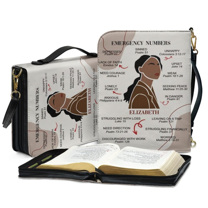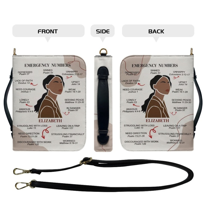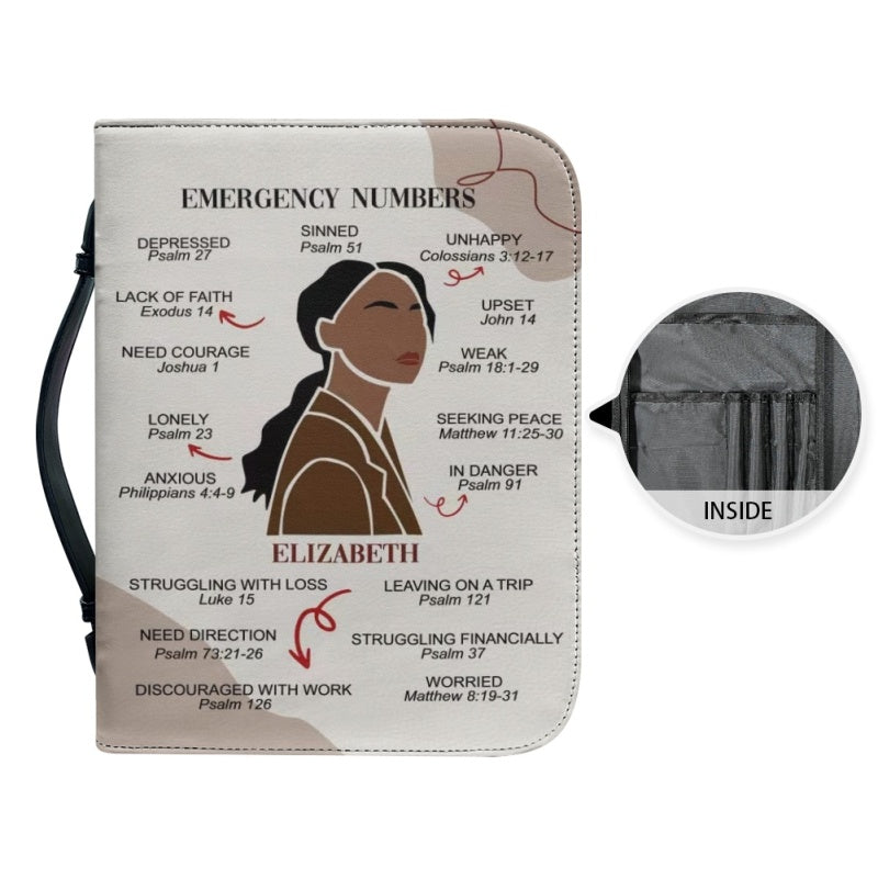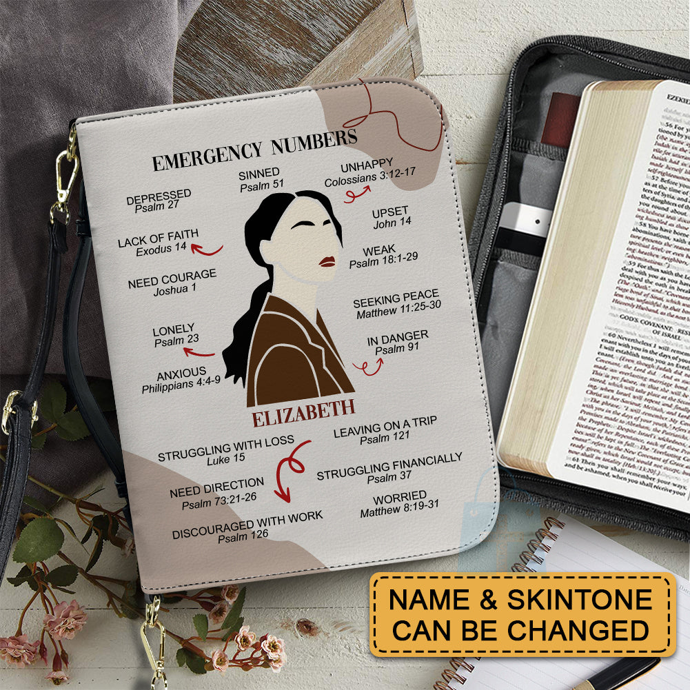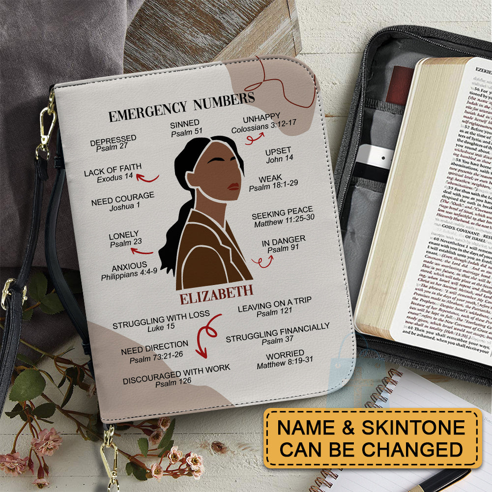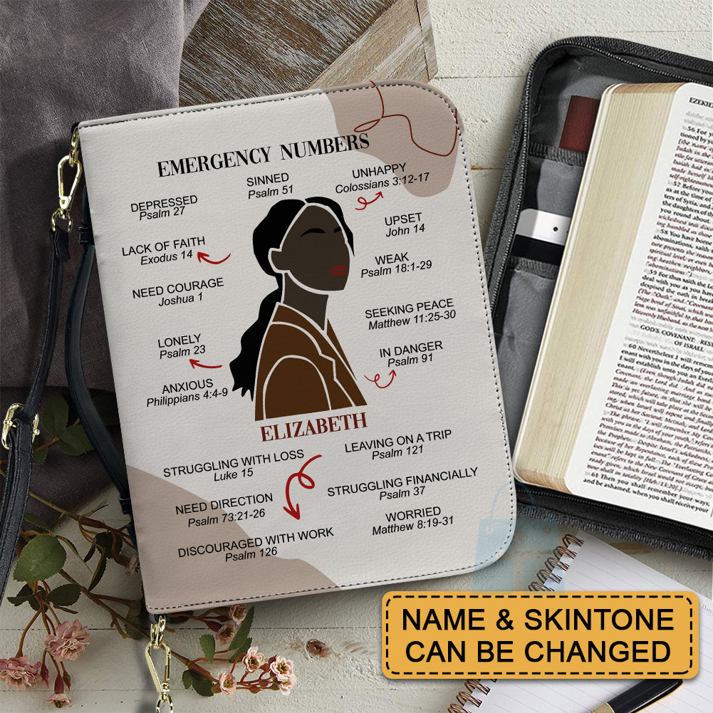 CHRISTIANARTBAG Bible Cover – "Emergency Numbers" Scripture Guide Design with Customizable Name, Skin Tone, and Hair Color | Spiritual Comfort and Guidance for Life's Challenges - CAB0130924