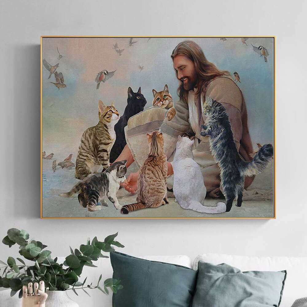 Christianartbag Home Decor, God Surrounded By Cats Angels Canvas Print Poster Jesus Wall Art Cozy Picture for Christian Gift Living Room Home Decor Cuadros