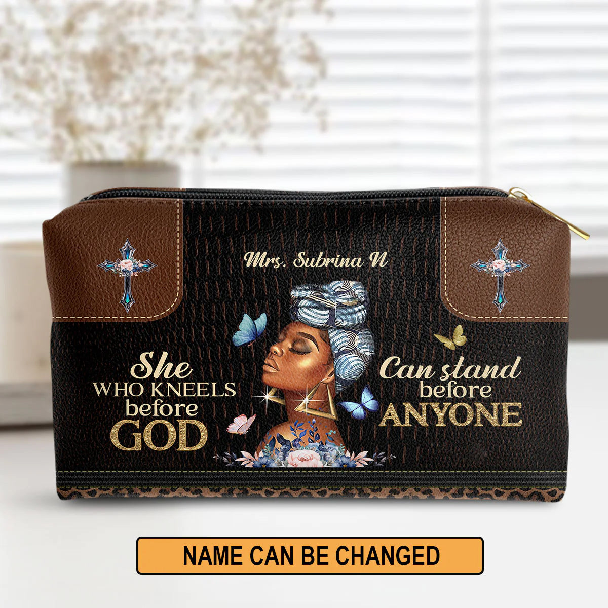 Christianartbag Makeup Cosmetic Bag, She Who Kneels Before God Can Stand Before Anyone, Christmas Gift, Personalized Leather Cosmetic Bag.