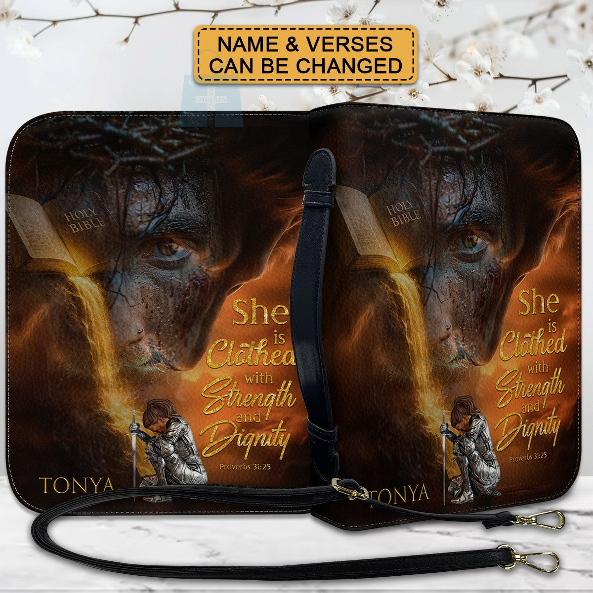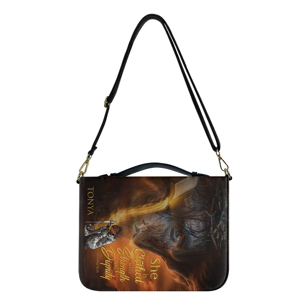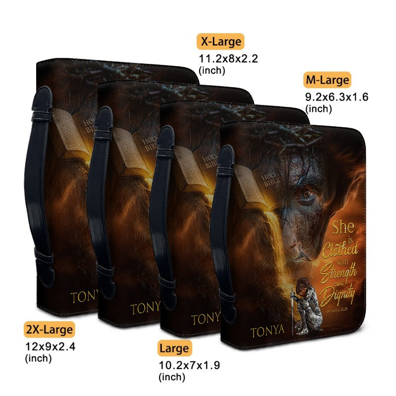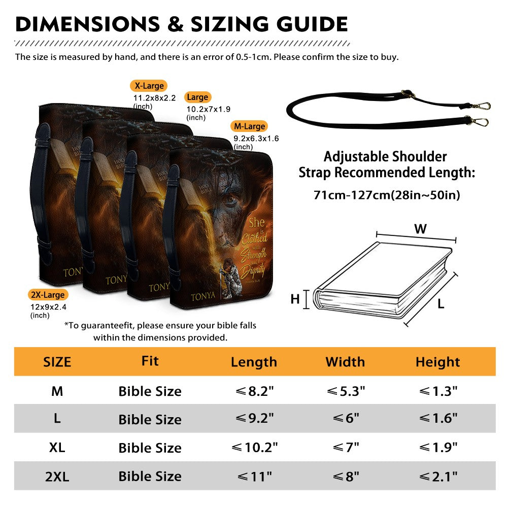 Discover strength in your faith with this striking Personalized Bible Cover featuring the Lion of Judah and a praying warrior. Beautifully crafted by CHRISTIANARTBAG, this custom cover includes your name and favorite Bible verse, like Proverbs 31:25. Ideal Christian gift for women who seek inspiration, protection, and grace on their spiritual journey. Made with premium materials and a detachable strap for convenience. A meaningful Bible protector and daily reminder of God's power and presence.