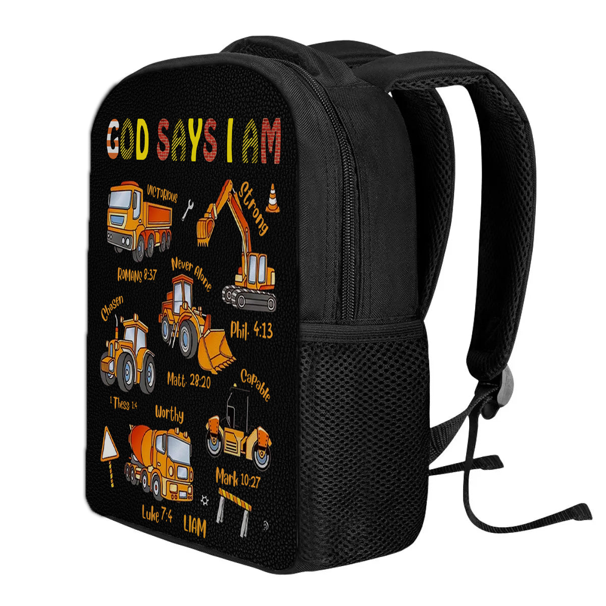 Personalized Christian Kids Backpack with Bible Verses – Construction Vehicle Theme – Back to School Gift by CHRISTIANARTBAG