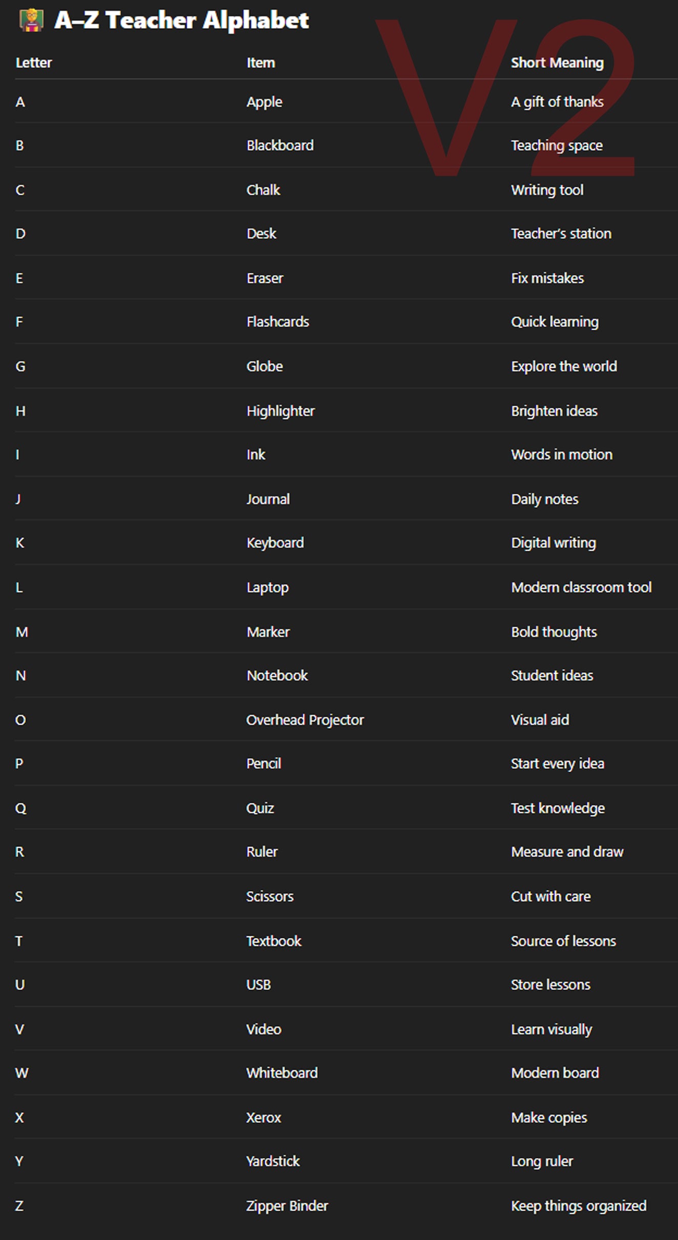Unique career-specific alphabet acrostic (Teacher, Nurse, Driver, etc.)