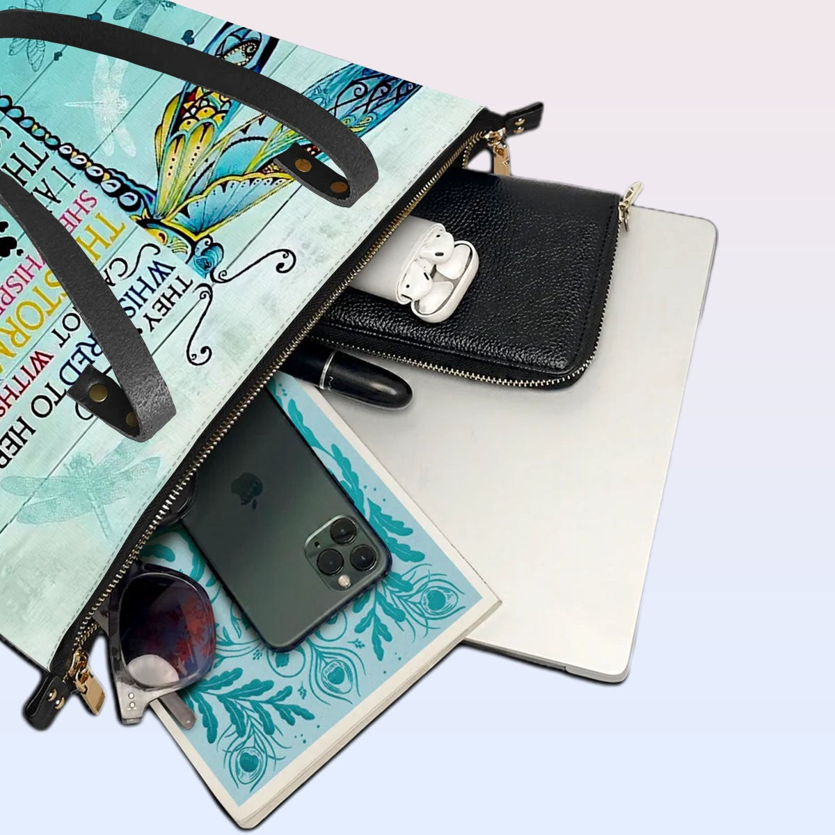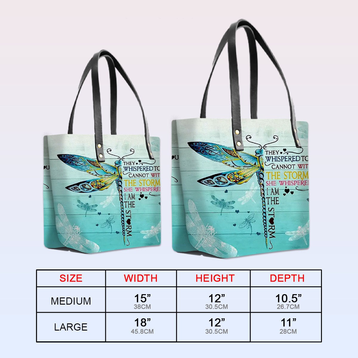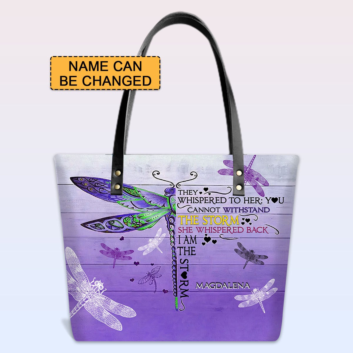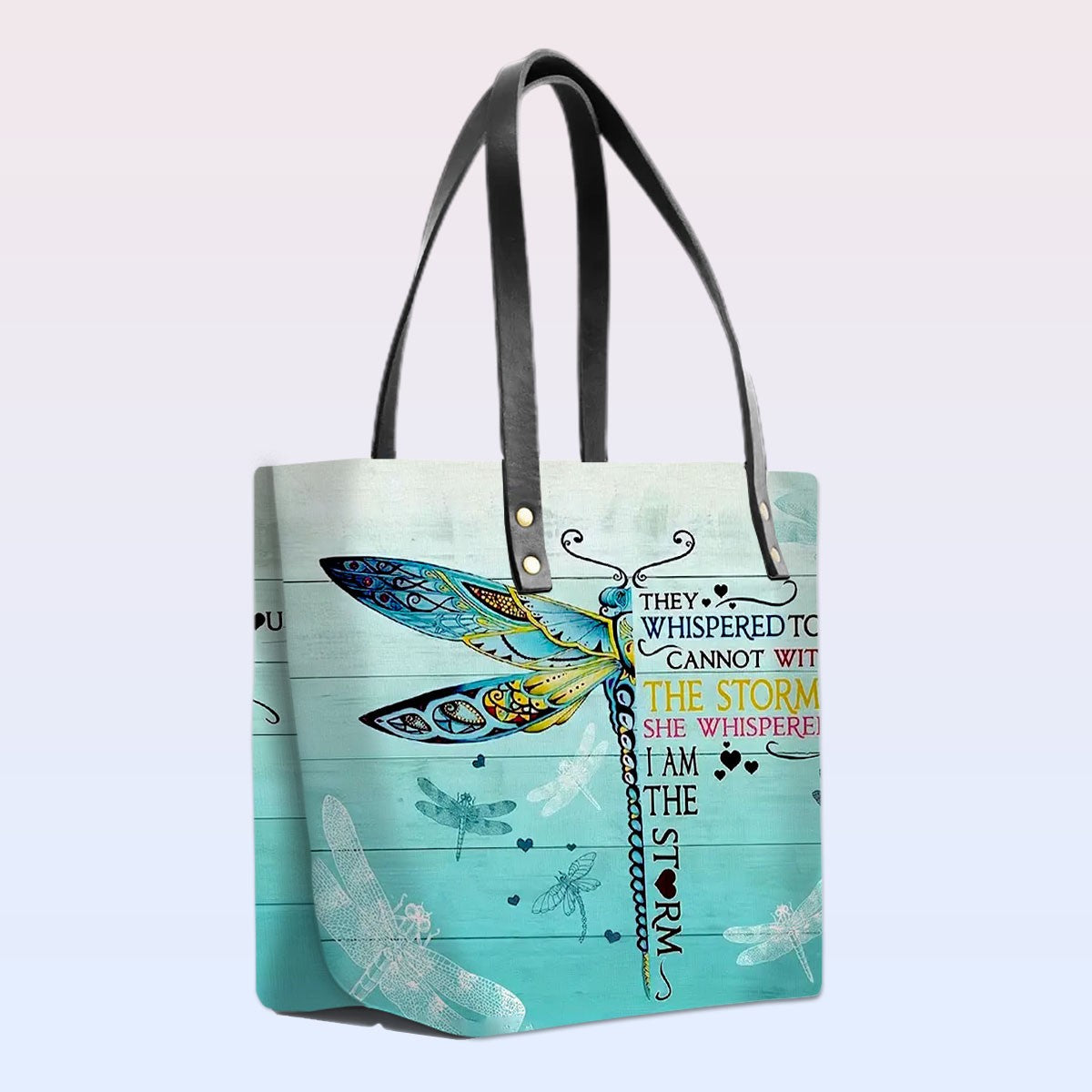 Personalized Leather Tote Bag with Bible Verses – I Am The Storm - Dragonfly | CHRISTIANARTBAG Leather TOTE Bag