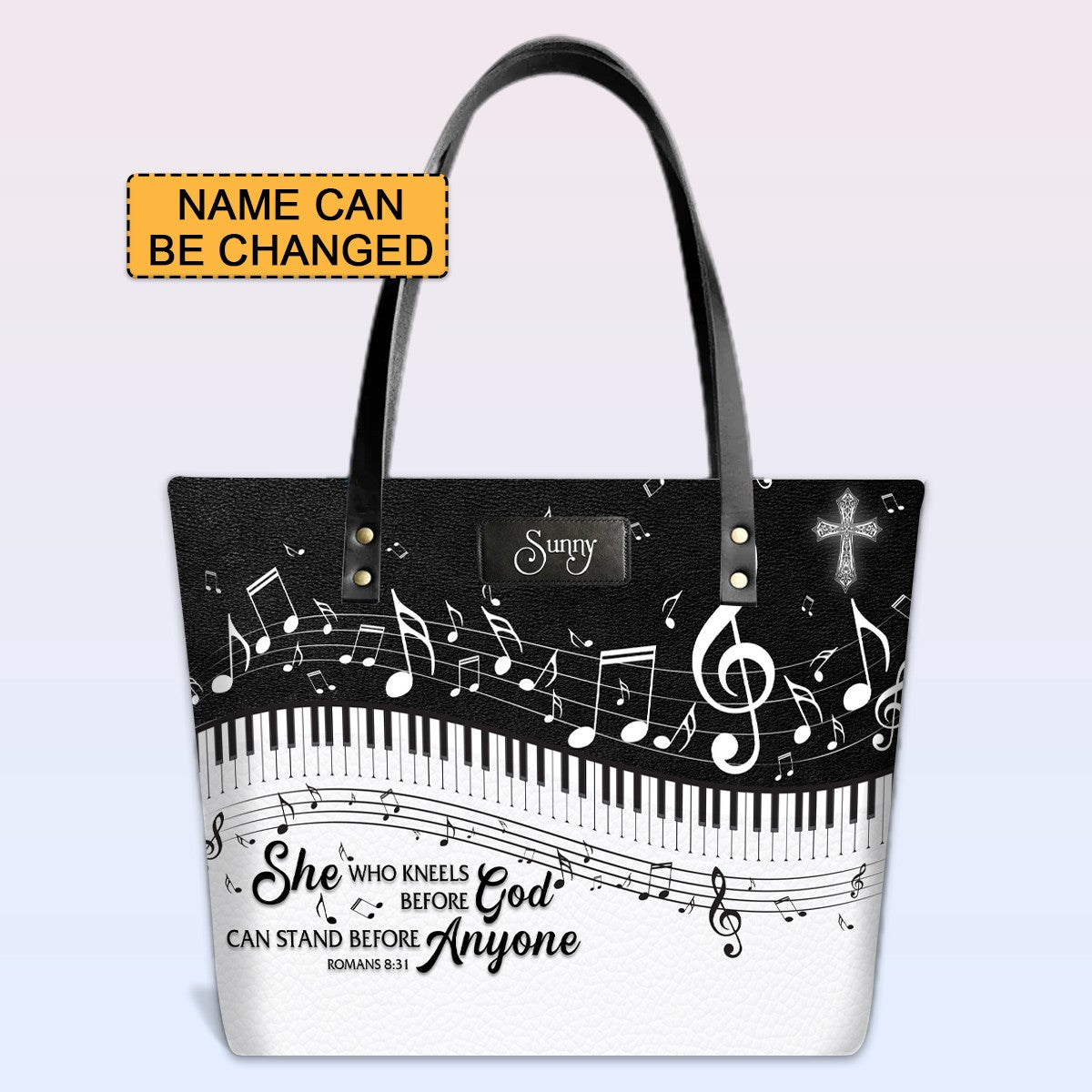 Personalized Leather Tote Bag with Bible Verses – She Who Kneels Before GOD Can Stand Before Anyone Romans 8 31 | CHRISTIANARTBAG Leather TOTE Bag