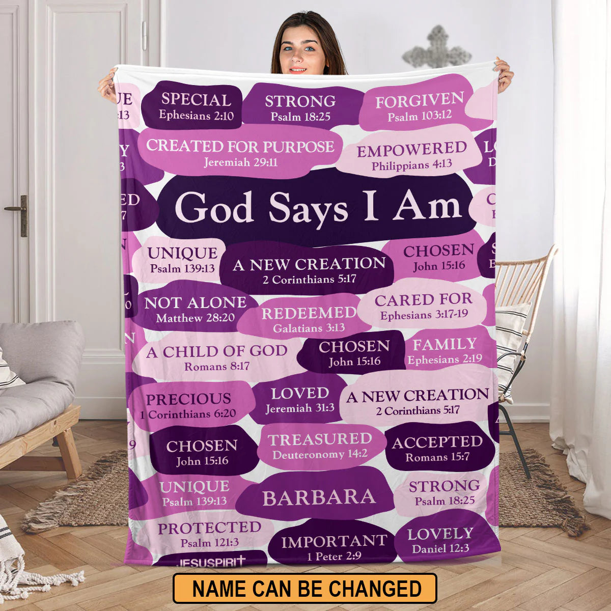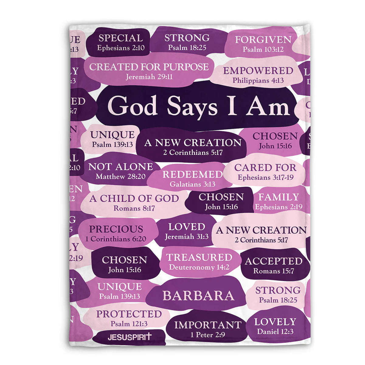 Wrap yourself in the comforting words of Scripture with the CHRISTIANARTBAG's Personalized Scripture Affirmation Blanket. This thoughtfully designed blanket features a collage of powerful affirmations and Bible verses that declare who you are in God's eyes. It’s a personal faith statement and a constant reminder of divine love and purpose. Customize it with your own name, 'BARBARA' in this case, to make it even more special and intimate. The soft, cozy fabric is perfect for curling up during your devotional time, creating a sanctuary for prayer and reflection. It’s not just a blanket; it’s a hug from God, making it an ideal gift for confirmation, baptism, or encouragement for any believer. Bring home this beautiful, custom blanket or present it to someone you love to envelop them in the promises of God's word.