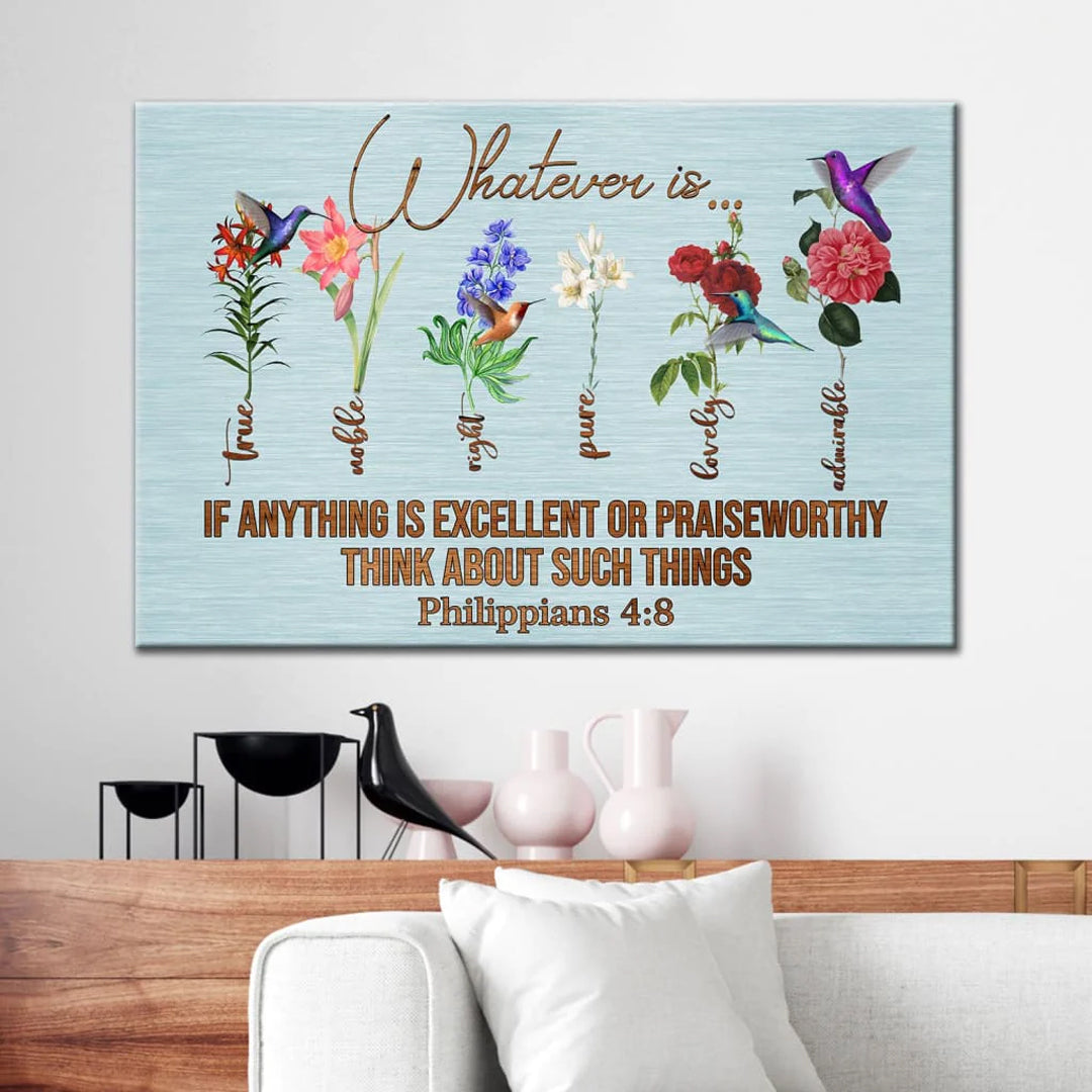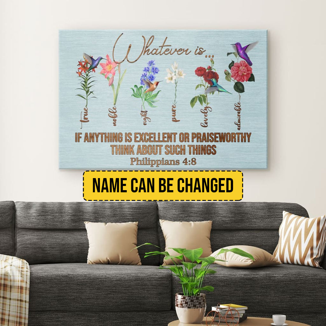 Vibrant Philippians 4:8 Customizable Canvas Wall Art - Spiritual Blooms and Hummingbird Decor